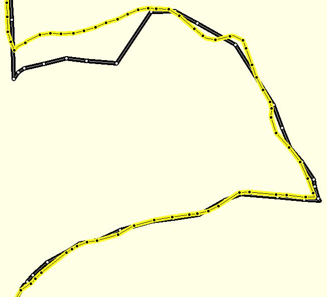 På bildet under er samme tur med svart logg fra 60C og gul logg fra Edge. Her ser man tydelig dels det at Edge setter ut tettere punkter (alt går å konfigurere selvsagt) men også forskjellen i antenne. Når det blir dårlig mottak så sliter 60C, men når den får tilbake full nøyaktighet så finner den sin plass i universet igjen, nesten like bra som Edge.