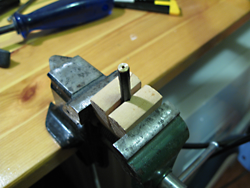 Jeg driver og kutter bremseslanger nå og har problem med å dytte dingsen som skal inn i slangen på plass. Jeg er stuck fire mm fra mål. Problemet er selvsagt at jeg ikke har nok å holde i mens jeg dunker inn dingsen med plasthammer el.