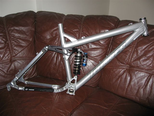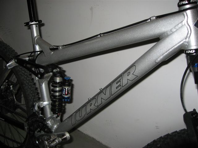 Turner 5 Pack ramme, str. medium, 06-modell. Dette er en herlig kombinasjon av RFX-frontramme og 5 Spot bakramme med 13,5 cm vandring bak. Ramma er i bunn og grunn veldig lik en standard 5 Spot, men er ikke så følsom på gaffellengden, og takler lengre gafler bedre. Med 520 mm gaffel har den ca. 68,5 grader styrevinkel og 72,5 grader setevinkel. Overrøret er 23,4”, dvs. at størrelsen er mellom Medium og Large 5 Spot.