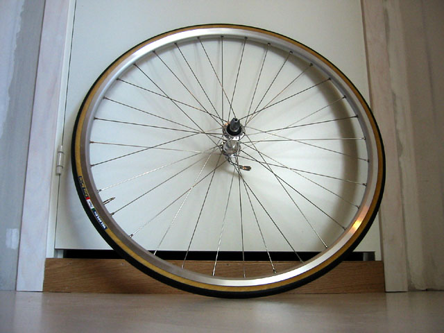 Da er forhjulet ferdigbygget og kan flyttes hit fra den andre tråden. Det ser jo veldig klassisk ut må man si. Vekt på hjulet (nav, QR, eiker, felg) ble 765g og komplett med felgbånd, slange og dekk endte det på 1147g. Sikkert blytungt med dagens mål, men forhåpentligvis lettere enn 1982 års modell.