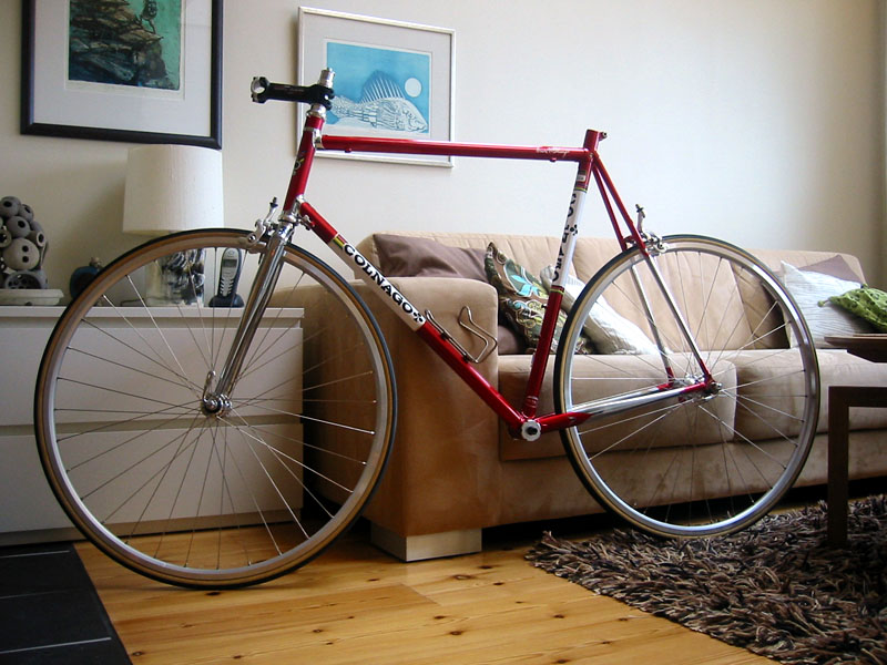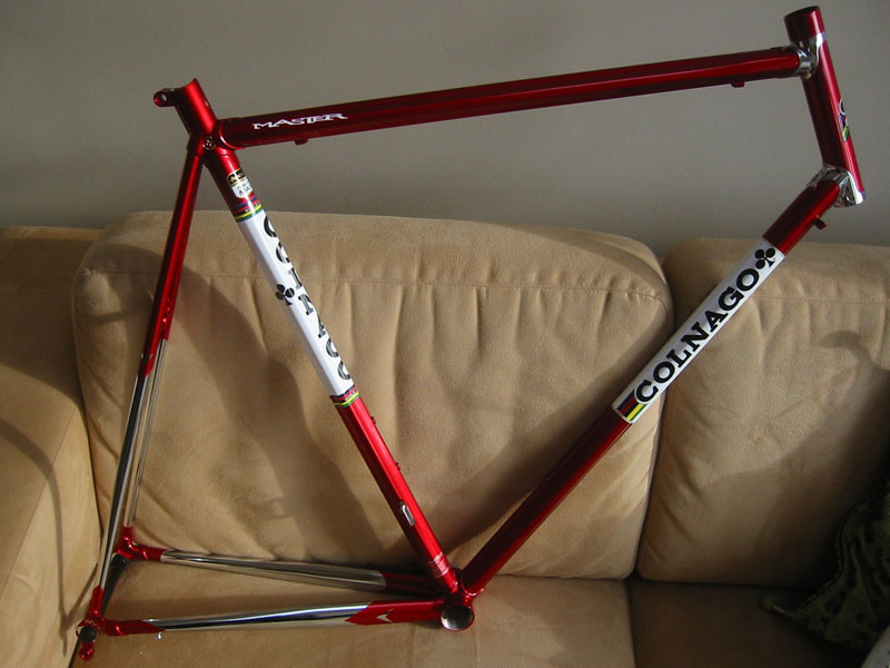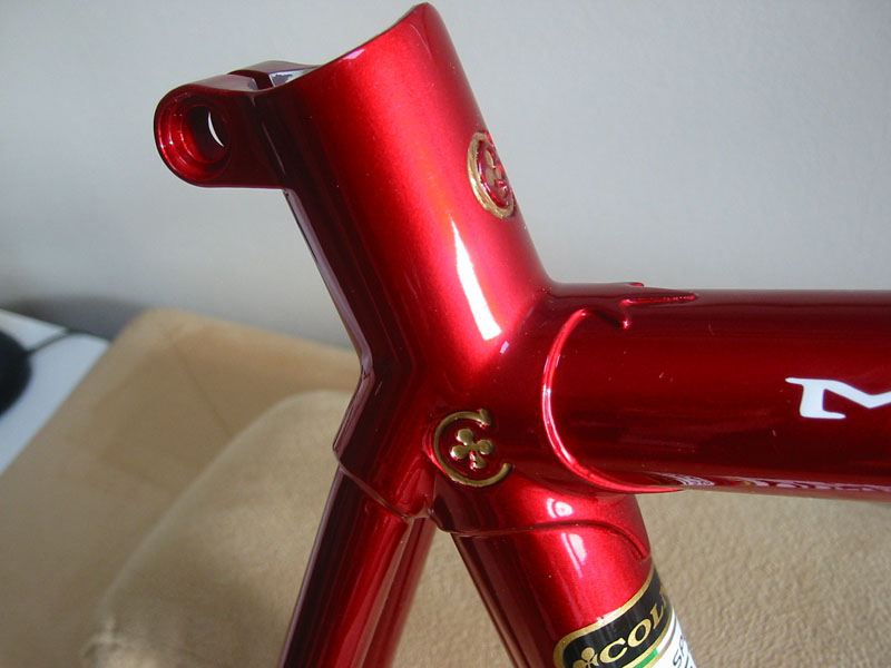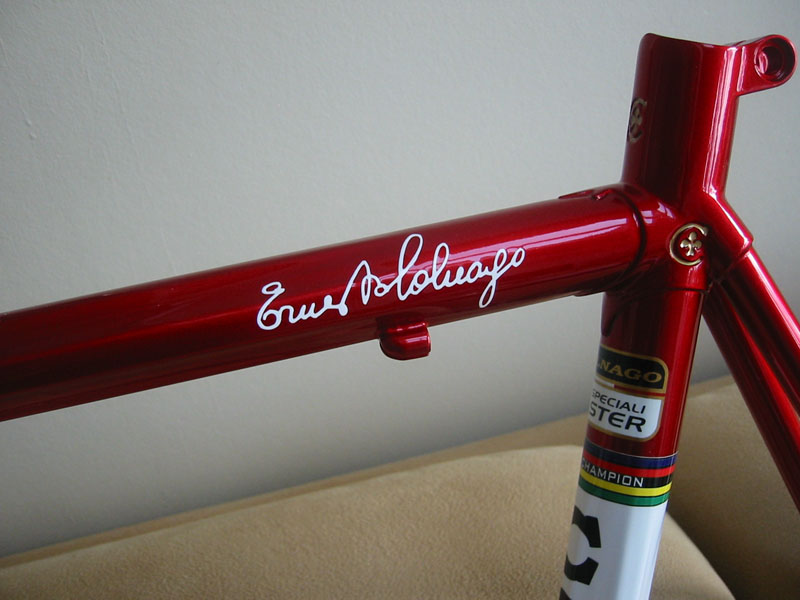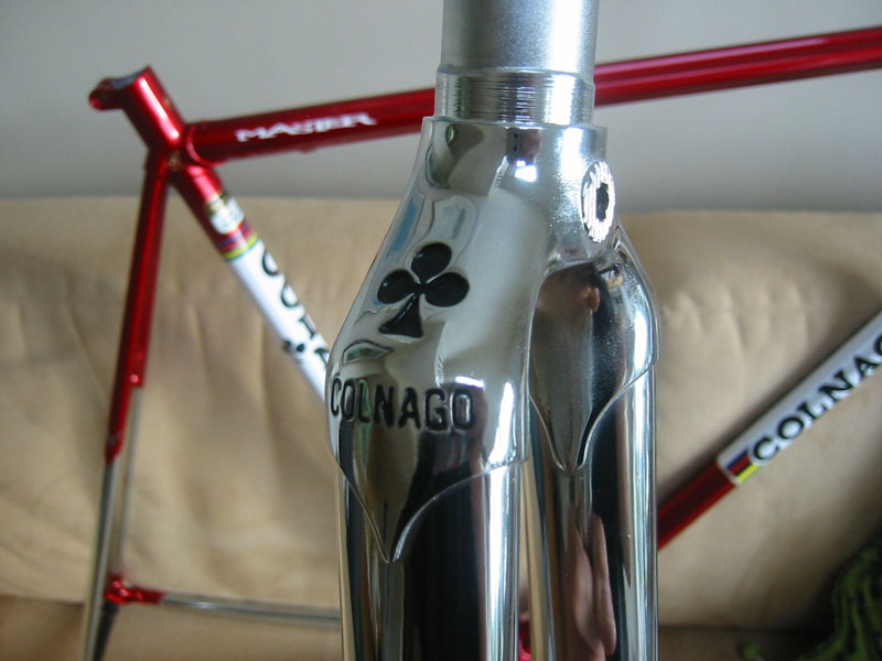 Tja.. Som en kar i Colnago-forumet på Roadbikereview synsa: Ramma er ikke noen skikkelig replica uansett og stålgaffelen er i hvert fall ikke periodekorrekt (den skulle hatt bøy nederst), så han ville heller spare noen gram.