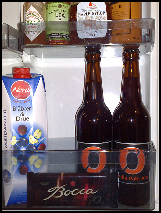 Skal ha en alenekveld hjemme med barna i dag mens fruen morer seg på helt andre kanter. Tittet inn i kjøleskapet og ble en smule glad. Noe har tydeligvis sunket inn. Takk, jeg har en veldig snill kone  Blåbær og druejuice, det beste jeg vet!  PS Bildet er tatt med den nye Nokia N82 med xenon-blitz. Bra kamera til mobil å være.