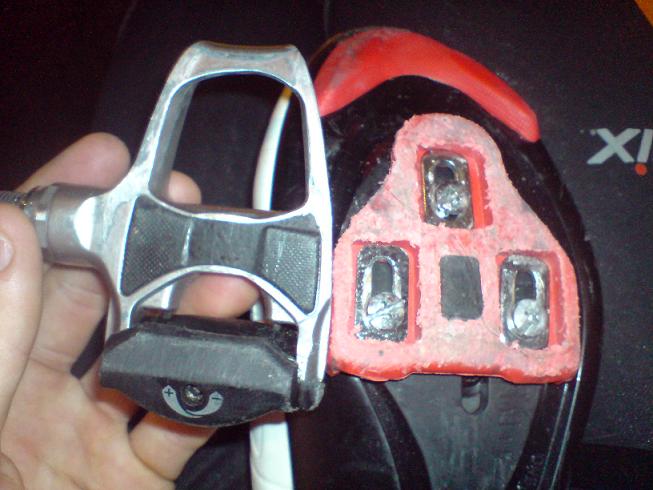 Hvordan lastet man bilder opp her igjen, har glemt det?...Det er et par Shimano Dura - ace pedaler og klossene er røde med tre skruer: 1 øverst og 2 nede. Klossen er relativt stor, ihvertfall i forhold til SPD klosser og de er laget i plast.