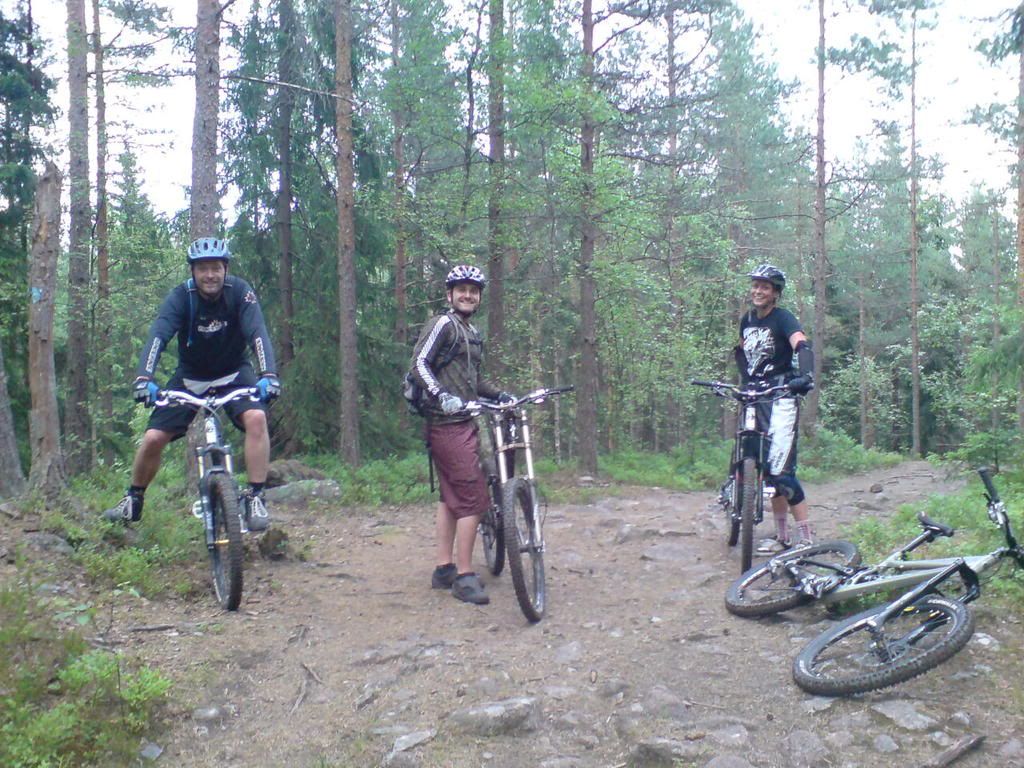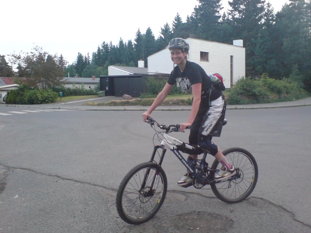 Det som er festet til overrøret er albuebeskyttere som jeg ikke hadde plass til i den lille rumpetasken min på vei opp med banen. Orket ikke å ha de på før jeg kom på sti.