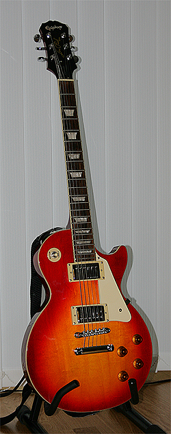 Epiphone er altså en amerikansk gitarprodusent som eies av Gibson, og som lager gode replicaer av Gibsons populære modeller etter samme spesifikasjoner som originalene. Å si særlig mye om Gibsons originale Les Paul Standard har kanskje ikke mye for seg, men den er i hvertfall i bruk av stjerner som Jimmy Page (Led Zeppelin), Mark Knopfler (Brothers In Arms og Money For Nothing er innspilt på en slik), Ace Frehley (Kiss), Paul Mc Cartney, Zakk Wylde (Ozzy Osbourne) og selvfølgelig trøndelags store sønn Torstein Flakne (Stage Dolls, The Kids (jepp, gitarsoloen på "Forelska i lærern" spilles på en slik!)). Standard er den beste modellen i Les Paul-familien, og må ikke sammenlignes med billigere versjoner som Special, Studio, 100 og flere.