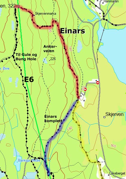 Bare for å klare opp i mitt eget hode: er einars på noe tidspunkt sammenfallende med blåstien fra E6 til Hammeren/Låkeberget? Jeg syklet ned blåstien i går og den nederste delen likner litt på ruta på kartet. Den øverste delen passet derimot ikke med beskrivelsen. Eller er einars en helt annen sti som går (noenlunde) parallelt med blåstien nederst? Noe av grunnen til min forvirring er at jeg rett og slett ikke har klart for meg hvor E6 tar av til Hobo og Bunghole...