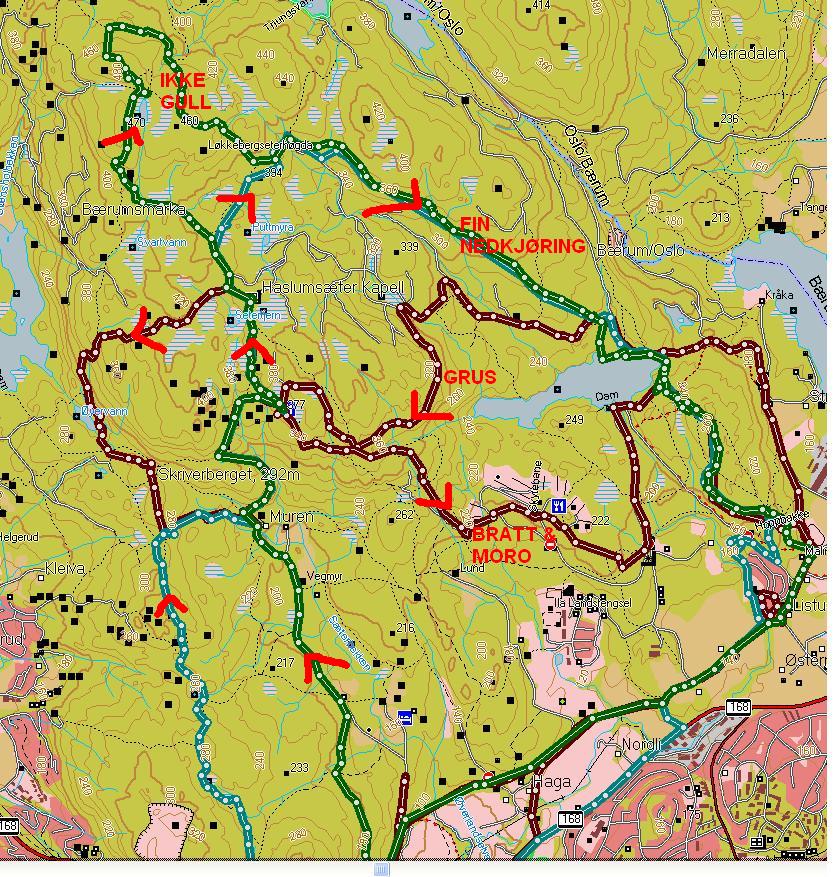 Har tegnet inn mine vanlige retninger, men en del av disse fungerer selvsagt begge veier. Mørkerød tur er den guidede turen som ble linket til. Lyseblå rute starter på grusen ved Stein gård, til Muren og videre over Brunkollen. Grønn rute starter i pilegrimsleden (stort blått skilt på grusveien). Denne er veldig fin både opp og ned. Den grønne ruten har en ekstra runde over Tjæregrashøgda - dette anbefales ikke, det var mye knot for lite moro. Den lyseblå snarveien er mye bedre, og nedkjøringen mot Østernvann og videre mot Fossum er veldig fin.