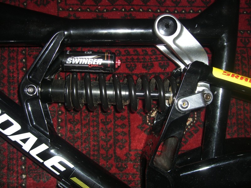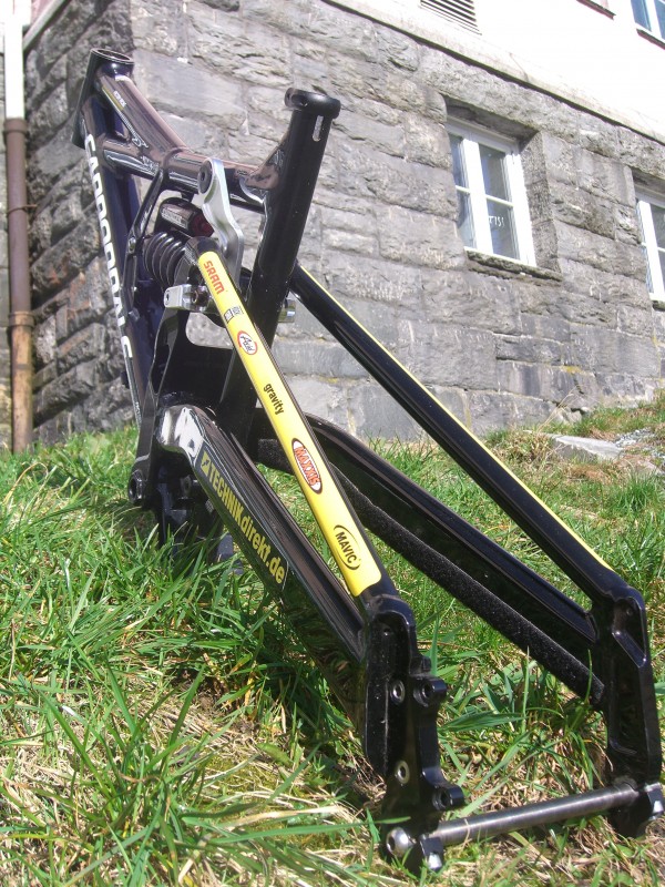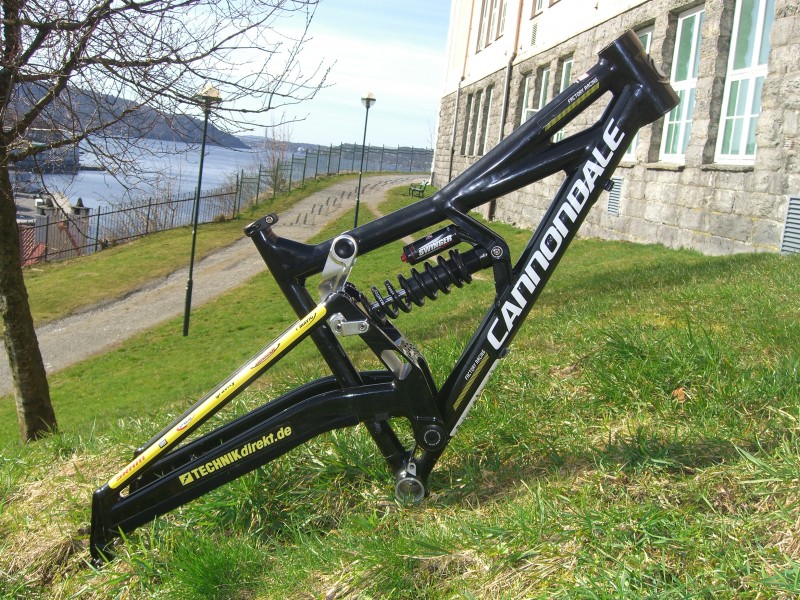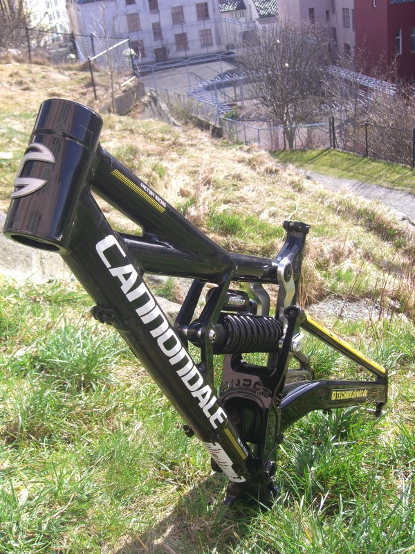 Jeg har et stykk ubetydelig brukt 09 Cannondale Judge ramme i sort (custom, ikke som de i katalogen) overflødig. Sykkelen ble kjøpt inn som delesykkel til min ramme i medium, men jeg trenger ikke rammen (duh). Rammen er en av max 6 slike rammer i verden (denne finishen, geoen er standard) og er helt sort. Ser en bort ifra dekaler, hvor alt er klistremerker, er det bare alu c'en framme som er permanent. En kan dermed bygge n uhørt klean sykkel. bakdemperen som følger med er en manitou 4 way swinger med 400-fjær tror jeg det er. Rammen har nye lagre i seg og vil bortsett fra et par ubetydelig merker være som ny.
