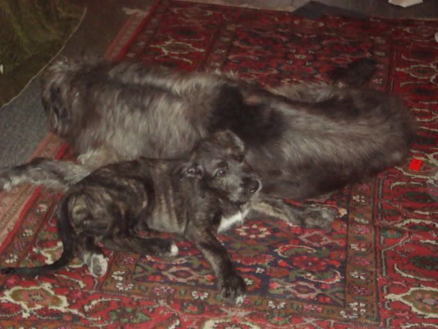 Grattis! Perfekt tidspunkt på året å få valp på. Dere kommer til å få et supermorsomt sommerhalvår! Hva slags rase er det?  Det er en Irsk Ulvejente, så vi holder oss til den rasen. Ikke så lett å se når hun er så liten som nå. Det som er fint er at jeg dro med en kamerat som hentet med seg broren hennes, så det blir mange turer sammen på stranden for de to tullingene, så kan de voksne hundene korrigere når det går litt vel mye over styr.