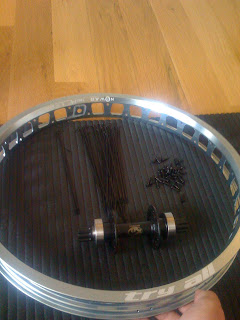 Hjulet ble bygget med cross 3 mønster. Og rosinen i pølsa ble et felgbånd i carbonfiber look ....
