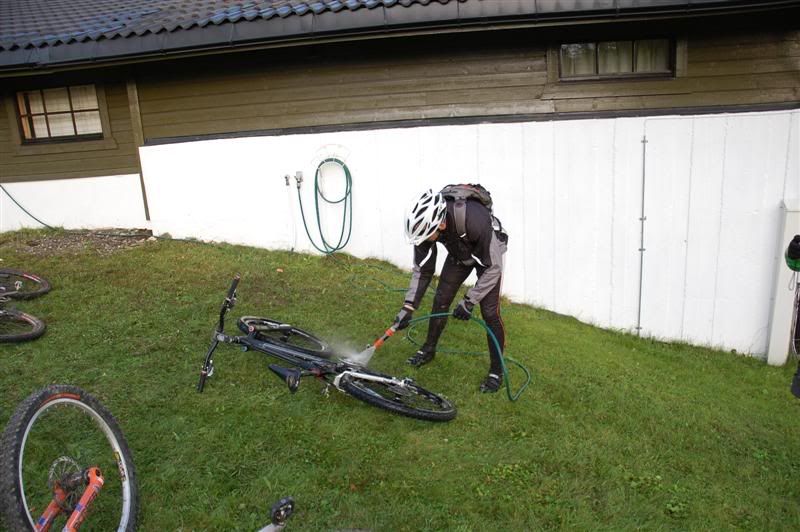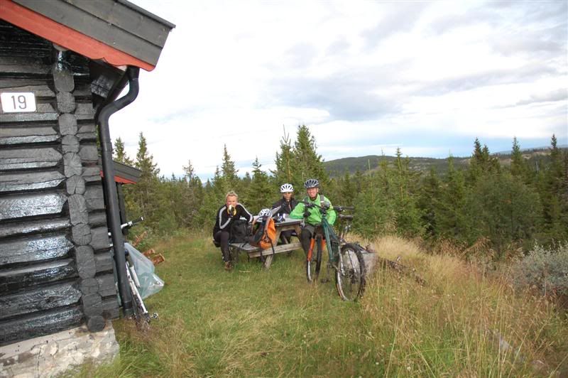 Enda noen bilder fra sykkelturen opp på Kyrakampen: Stien tok altfor fort slutt,men artig var den Pause ved den første hytta vi kom til Erik vasker Spoten