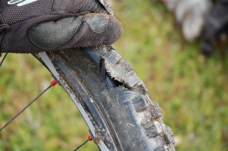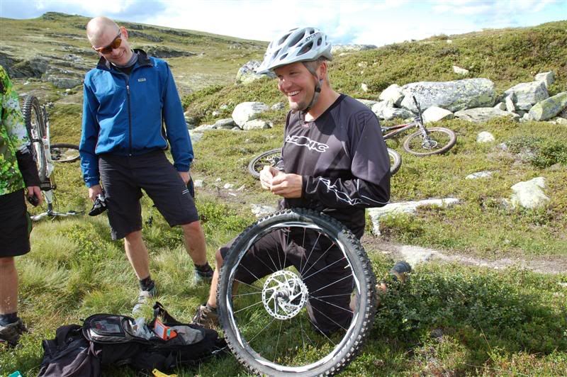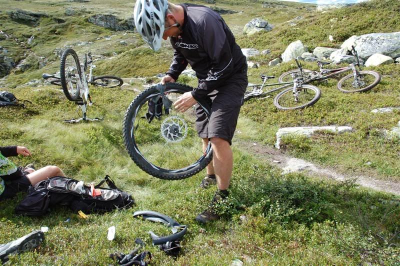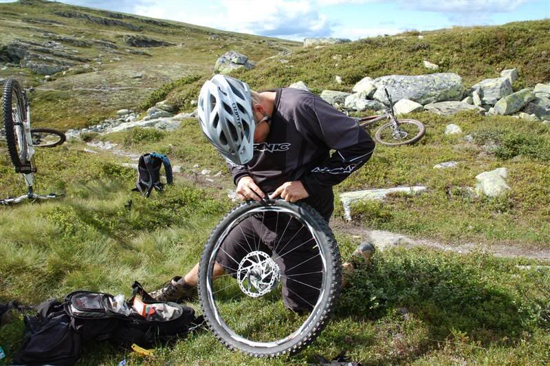Enda ti bilder fra fredagen: Christian og Erik skifter slanger Gjermund sykler mens Harald synes det er like greit å gå Erik suser avgårde mot Bånnseterkampen Resten av turfølget prøver å ta han igjen Harald,Christian,Gjermund og Svein Christian har punktert igjen Oooops! Han har gjort skikkelig arbeid denne gangen Christian "Macgyver" er like blid Inge beundrer lappingen hans Sånn,nå er dekket lappet på både innsiden og utsiden En slangebit ble knyttet rundt for ekstra sikring Dekket holdt hele turen,så Christian hadde gjort godt arbeid