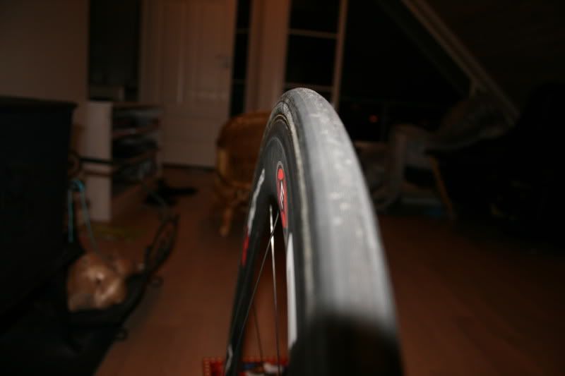 Ok Nå har jeg fått av dekket og limt det på nytt. Nå ser det ut til å være rett på felgen. Skal i gang med bakhjulet nå. Da blir det to tynne lag på felgen som begge får tørke over natten, og ett tynt på dekket som også skal tørke over natten. Til slutt ett lag på felgen som ikke skal tørke. Satser på at dette blir bra.