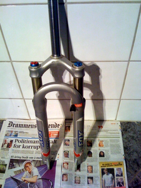 Jeg vurderer å selge min fox demper fra 2006.Kan ta en lett, hvit demper med 100mm vandring i bytte. Den har 80 mm vandring, og funker helt utmerket! 18 cm styrerør og den veier 1540g. Veid på kjøkkenvekt. Fin og se på, få bruksmerker. Har aldri hatt noe problemer med denne i de fire årene den her vært min! Knall demper! Beklager dårlig bildekvalitet, men eneste kamera som finnes i huset her er på telefonen min. Kameraet døde i vaskemaskinen.