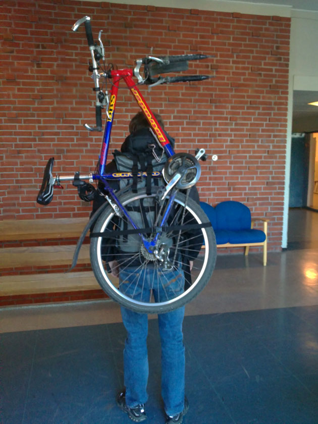 Kult prosjekt! Litt av utfordringen ligger kanskje i å få til en konstruksjon som holder sykkelen på plass og samtidig føles behagelig på ryggen, men ikke oppleves som stor og uhåndtrelig på veien ned igjen. Vektplassering er vel også viktig, plasseres sykkelen utenpå en sekk, langt vekk fra kroppem, blir det sikkert fort baktungt og vanskelig å balansere.