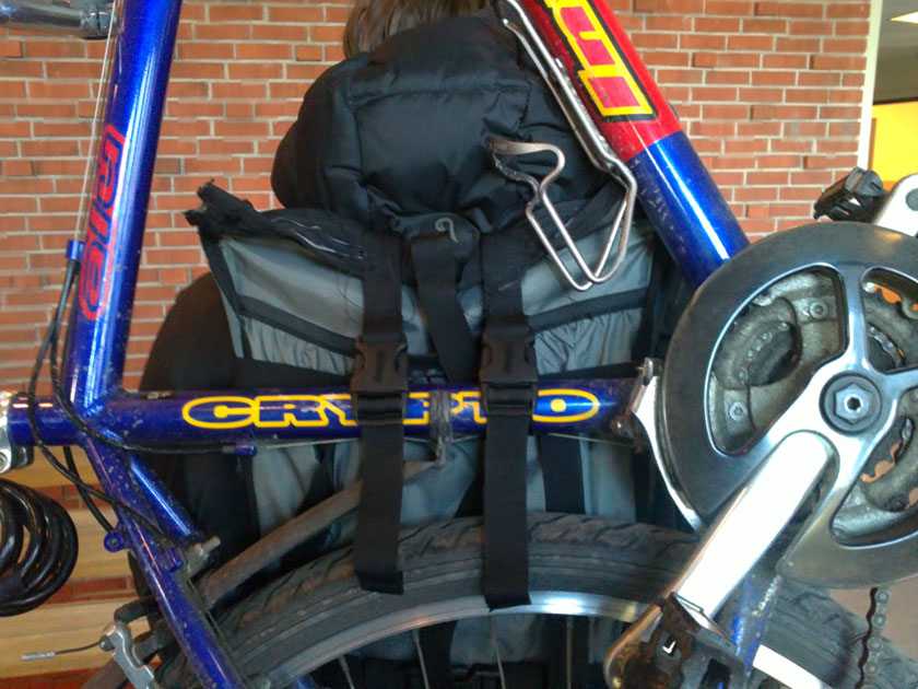 Jeg ville sjekket litt mer på en løsning hvor sykkelen (ramma) ble festet så nærme kroppen som mulig og da helst mellom stroppene og selve sekken.