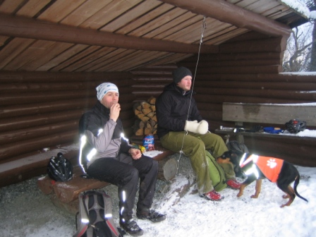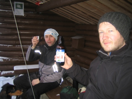 5mm snø ble til 10cm snø og kuldegradene var 8 i tallet. En meget hyggelig tur som endte med otb for min del og et kne som nå ikke lar seg bøye i nevneverdig grad. En liten trøst er det at jeg ikke er den eneste som fikk en smell. I gapahuken på setra troppet Finn opp til fots og serverte trøstejuleøl til de skadde. Prisen vi betalte for den altfor lange rasten var ekstrem nedkjøling. Makan.