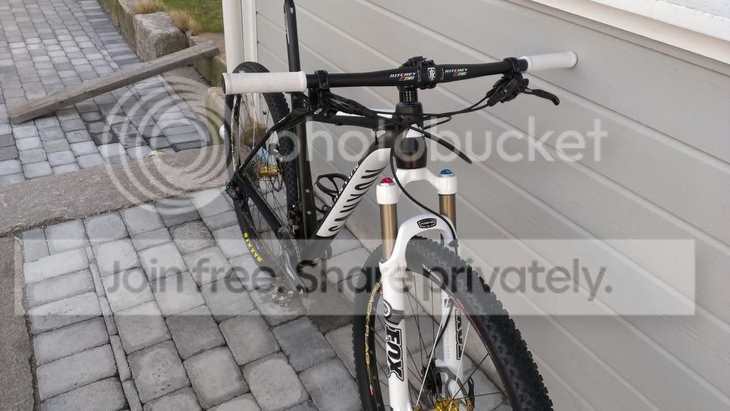 Det er et Ritchey stem, kjøpt på R2 Bike. Måtte få styret lavere, siden Lefty'n bygde litt mye. Styret er 62cm. Sykkelen veier 7,8kg med hjulsett på 1070g, så det blir vel greit nok....