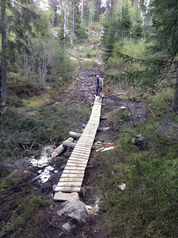 Det er et vanlig triks på northshore-konstruksjoner, å bruke hønsenetting oppå plankene, men det gjør seg vel ikke helt ute i skogen.