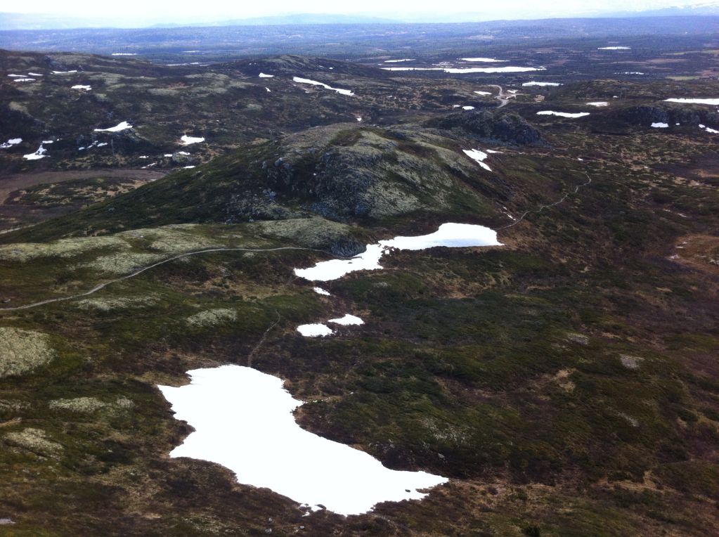 Virker litt vått enda. Første terrengparti, hvor det er løypekryss ved hytte.    Snøfonna er kanskje litt mindre enn normalt?