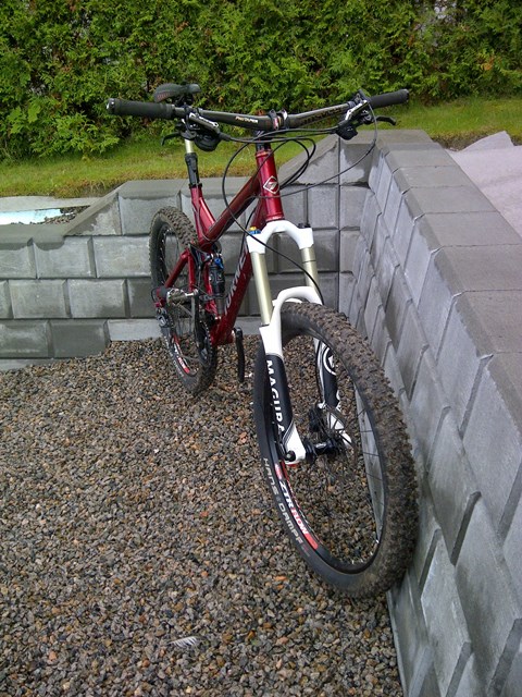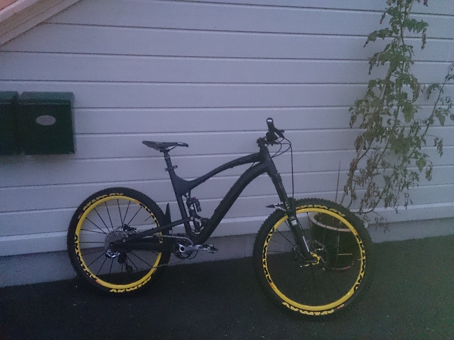 Endelig fikk jeg min i hus! Canyon Nerve Al+ 7.0. Håper å få tid til å prøve den i dag! Har brukt de siste dagene til å feste rammebeskyttelse, kjedestagbeskyttelse, Bender Fenders og satt dekka opp slangeløst, samt fått satt sag nogenlunde. Må leke litt med rebound fremover til jeg finner "the sweet spot". Har satt de på midten nå, så får jeg se hvordan det er. Jeg har aldri hatt fulldemper før så dette er nytt for meg. Skal få tatt et bedre bilde på sikt.