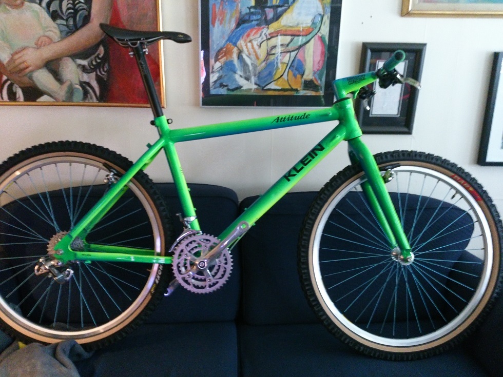 Kokt i kålen og stolt av det! Det lokale stilpolitiet e heldigvis ikkje like krakilsk sånn at når den dagen kjæm at æ skal få lakka en Manitou gaffel med Kleinkrona i S&S før å sette på den gamle Attituden min kan æ gjøre det med glede, Controltech stikkakslinga, gule!(fra Judy SL perioden) Hügi nav og ka slags felgringa man skal finne når Mavic Citron fargen ska erstattes gjenstår å se, men drømmen e et funn av to gamle 117 ceramic felga :-)