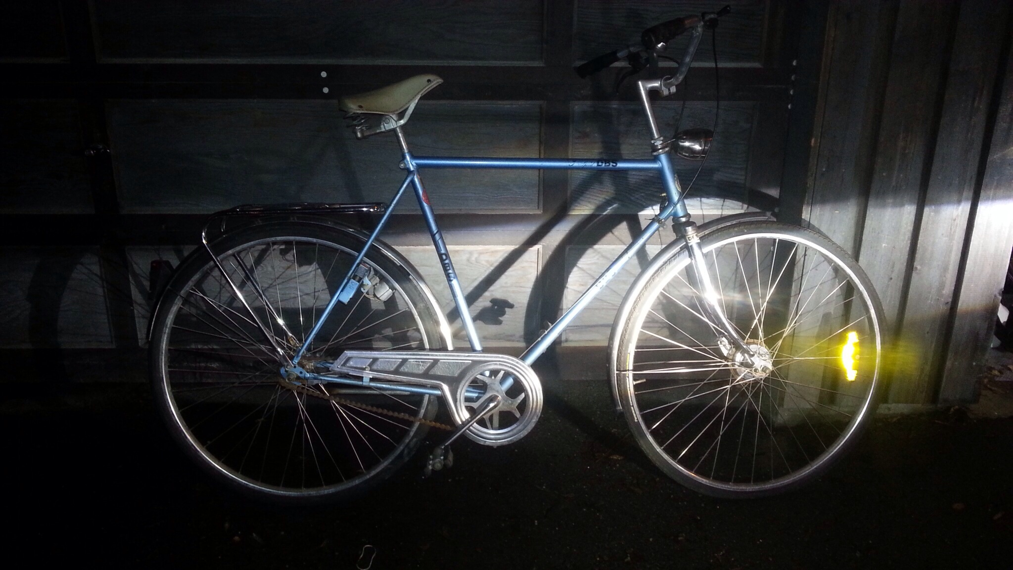 DBS tregirs herresykkel fra forrige århundre gis også bort. Bakhjulet har noe kast, men går rundt som bare det. Det gamle styret rustet i stykker, så det er byttet ut med et aluminiumsstyre fra Biltema.