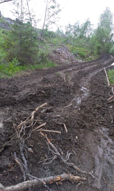 Skogsmaskinene har ødelagt bakken opp fra broa igjen. Ser ikke ut som så mye stier er berørt men de er ikke ferdig enda. Bildet er nederst mot den første brattbakken. Men sist gikk de over veien med gravemaskin etterpå