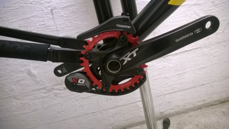Chain guide og kranklager installert. Skulle vært Saint-lager, men fikk et vanlig og nytt shimanolager gratis. Mulig den nedre kjedeføreren tas av pga clutch bakgir. Sort XT krank med rødt 32t WolfTooth drev kommer kanskje neste uke.