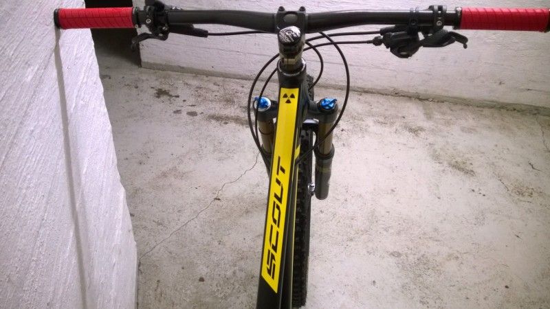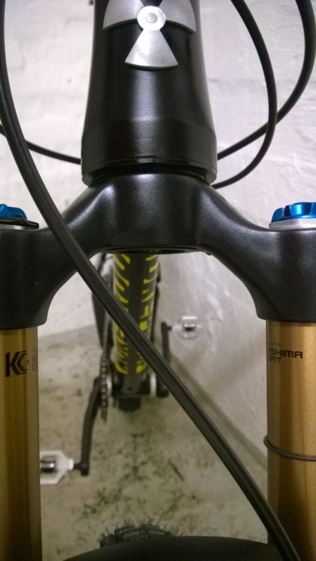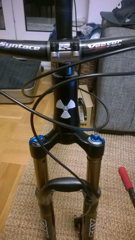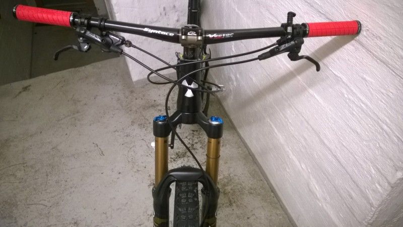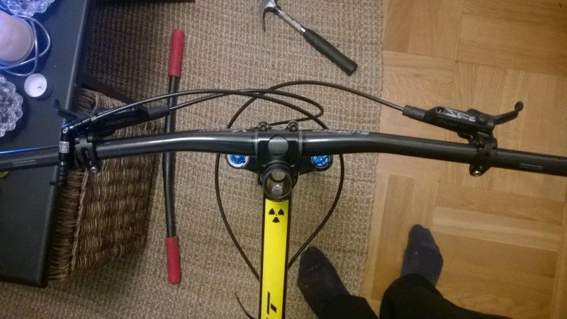 Går fremover. "Styrhuset" er mer eller mindre ferdig. Fikk kuttet Reverb og bremseslanger i går. Skal plukke opp girskifter m/ tilbehør i ettermiddag. Og Nukeproof-gule holker monteres etterpå. Gaffelrøret tør jeg ikke kutte før hjul er montert og jeg fysisk kan teste sittestilling  Skulle opprinnelig vært et alu-styre fra Syntace, men denne bestillingen rotet sykkelkomponenter.no litt med. MEN: pga rotet fikk jeg veldig gode prosenter på valgfritt lagerført Syntace-styre. Styret var i hus dagen etter. DET er hva man kaller glimrende nettbutikk!!  Spørsmål: når man kutter Reverbslangen, trenger man å etterfylle litt olje? Noen nettvideoer sier dette, andre ikke. Den fungerer jo etter hva jeg skjønner nå, uten etterfylling.
