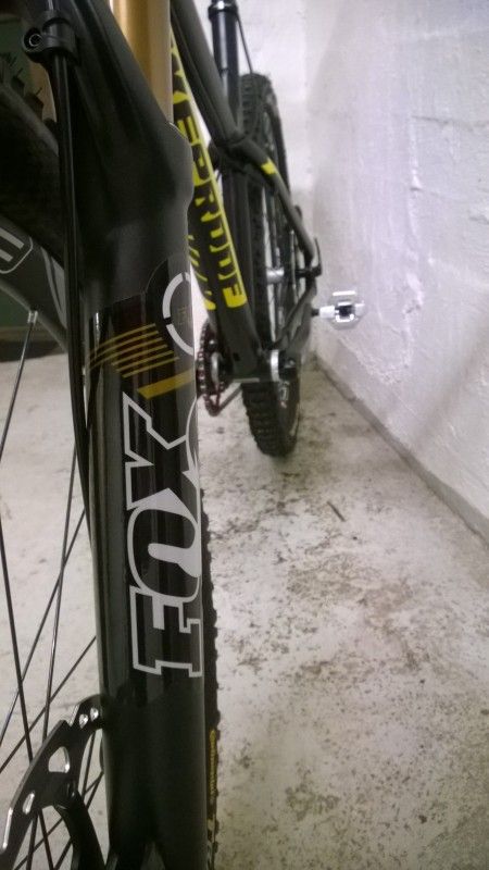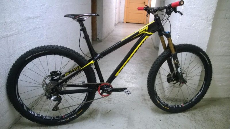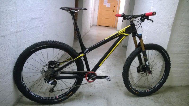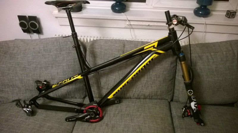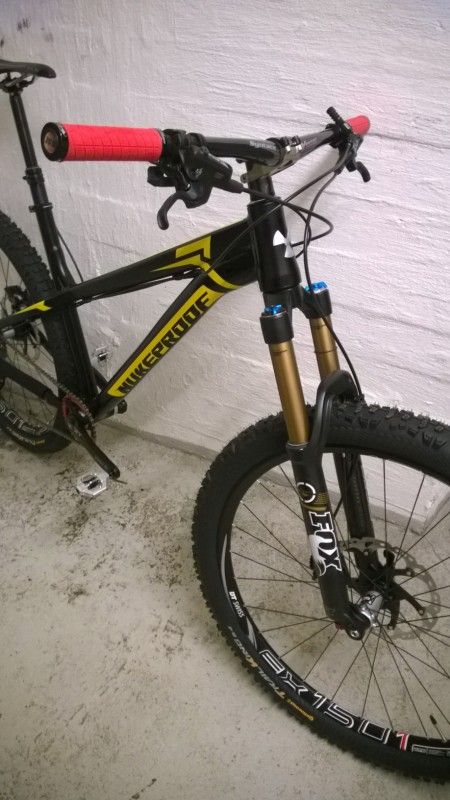 Ferdig!         Spec Nukeproof Scout ramme Nukeproof Warhead styrelager Shimano XT kranklager Fox TALAS 34 Kashima 150/120mm gaffel Renthal Duo stem Syntace Vector carbon 740 styre Holker fra Lizard Skin Shimano Zee bremser med 203/203mm bremseskiver Shimano Saint girtrigger Rock Shox Reverb setepinne Selle Italia sete DT Swiss EX1501 Spline 15/12mm hjulsett Continental Trail King Protection 2.4 dekk Shimano XTR kassett Shimano XT kranksett med 32t WolfTooth drev Shimano XT kjede Shimano XTR bakgir m/ "clutch" KCNC keramiske trinsehjul Nukeproof chainstay beskyttelse
