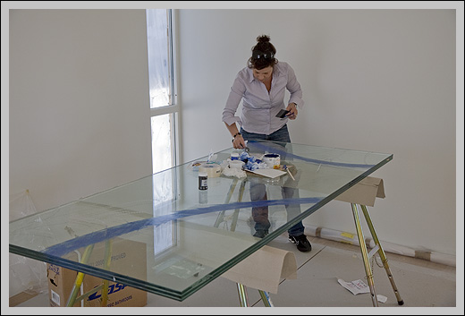 Spesiallaget av Daaland Glass & Fasader som en del av hele den glasskarnappen. Dette er tre lag glass laminert sammmen til 30mm tykkelse. Hele plata veier 190kg og i Daaland sier at den skal tåle at hele familien står og hopper på den samtidig. De tror stålvinklene som holder den ryker før glasset. Her er historien fra ankomst Tiller til montasje: