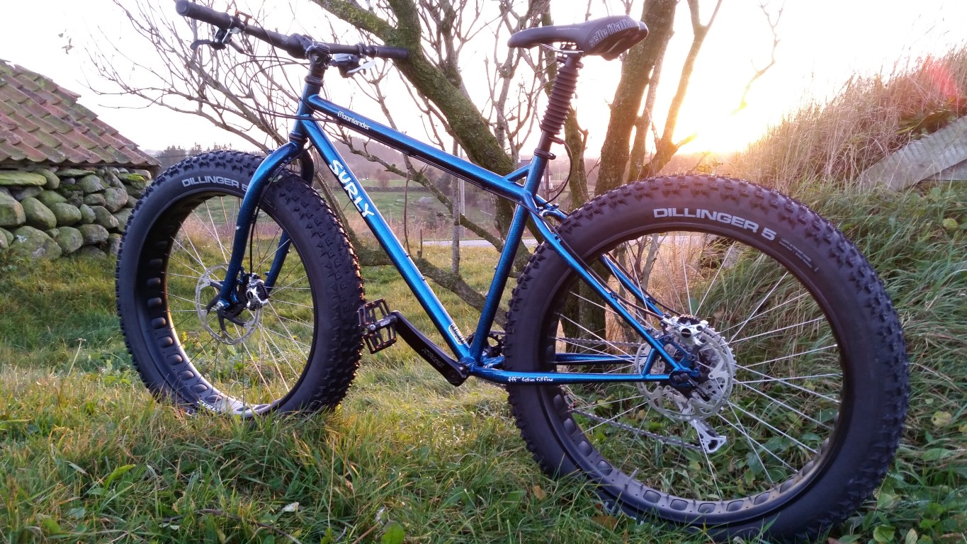 Tja, jeg kjøpte den pent brukt (er faktisk fjerde eier, utrolig nok) og ferdig oppgradert med blant annet Bluto og JJ. Veit ikke hvor de JJ'ene kommer fra. De originale Surly Bud&Lou fulgte også med og skal konverteres til piggdekk.
