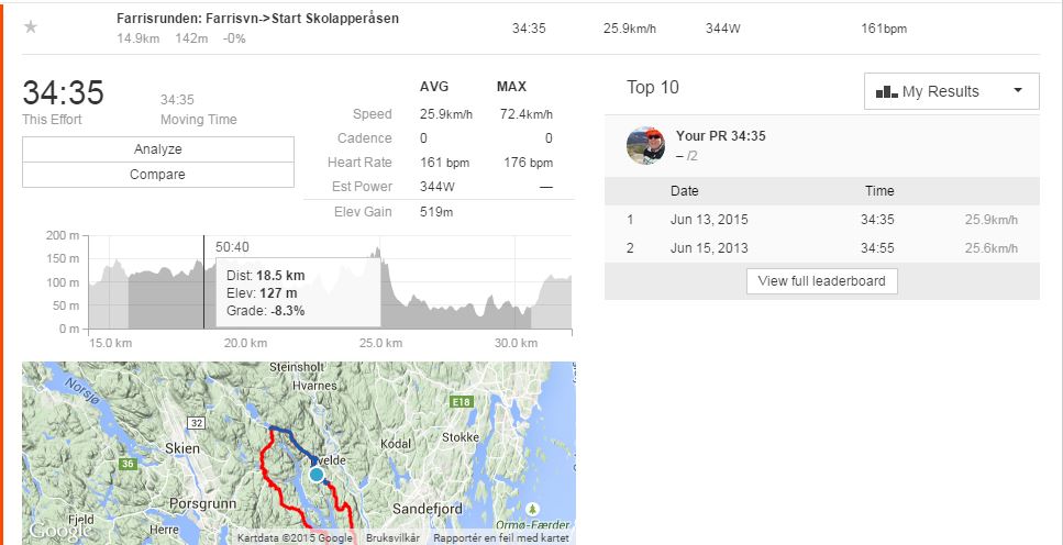 Jeg prøver å legge ved et klipp, der Strava klarer å vise begge treningene. Og her finner faktisk Strava begge på to på samme segment, men viser ikke PR på dette? Rart?