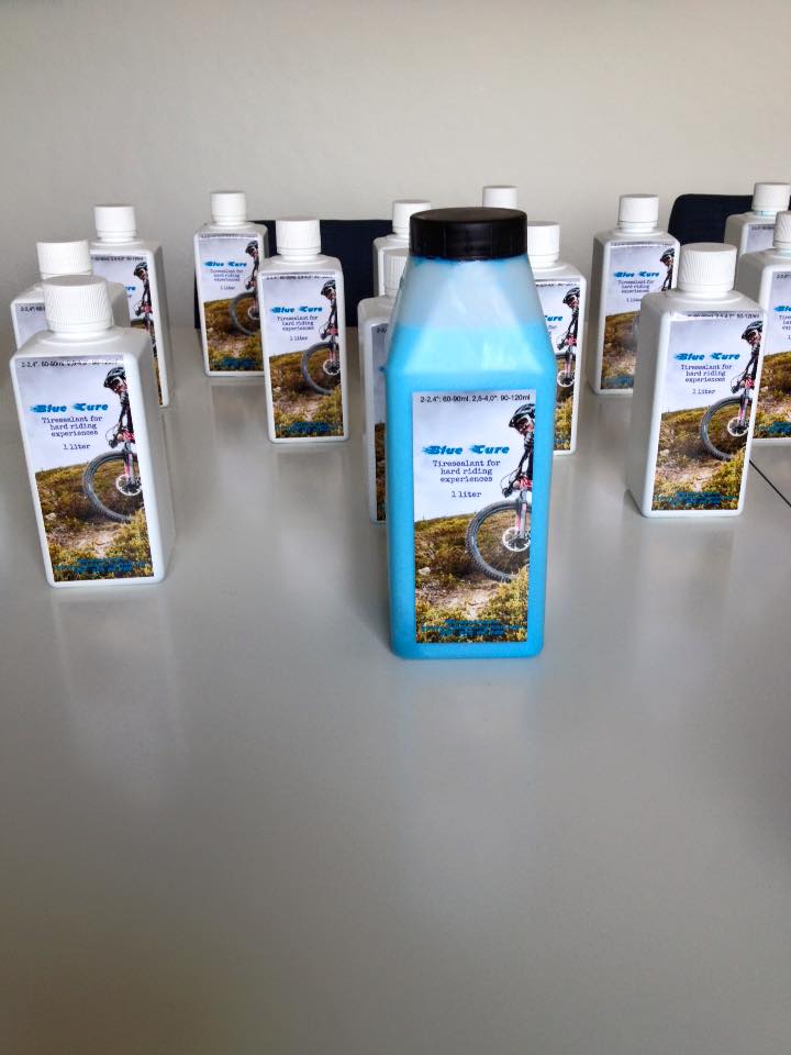 Hjemmelaget lateksbasert tubeless guffe selges i halvlitersflasker.
