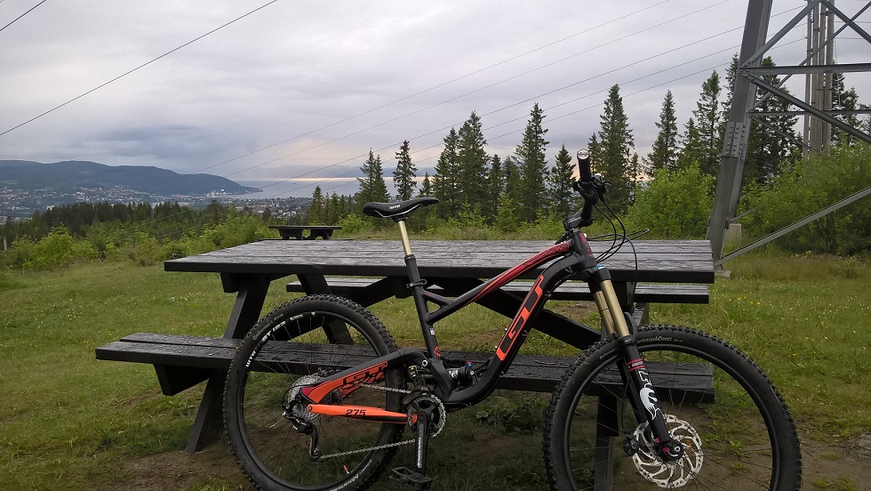 Min Specialized Enduro med Ranheim, og Trondheimsfjorden i bakgrunnen.