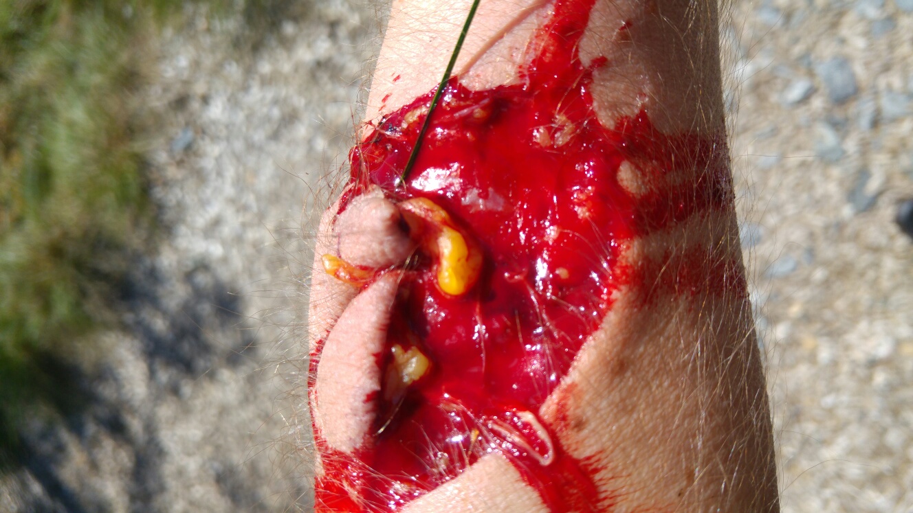 Det som skjedde, var altså at da jeg syklet forbi, ble huden på yttersiden av venstre underarm gjennomboret av den skarpe stubben, og hektet seg fast. Jeg ble stoppet i ferden og falt i bakken. Trestokken hadde da boret seg anslagsvis fem cm under huden, og da jeg falt, ble hud og underhud flerret til side i et område på ca 5 x 7 cm. Kort sagt så jeg rett inn på min egen muskel. Det gule på bildet er underhudsfettet.