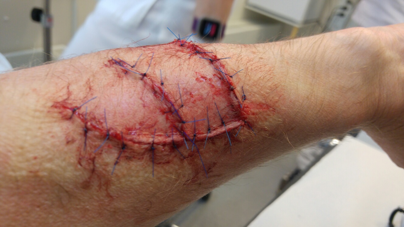 Det rare er at dette ikke var vondt, med unntak av en kort periode i går kveld. To Paracet og en Ibux var nok til å fjerne smerten. Jeg går på en antibiotikakur som virker dimensjonert for en middels fjording, men legen mente jeg kunne ha håp om å være i gammelt slag når stingene er tatt om to uker. Ingen nerver eller sener er skadd.