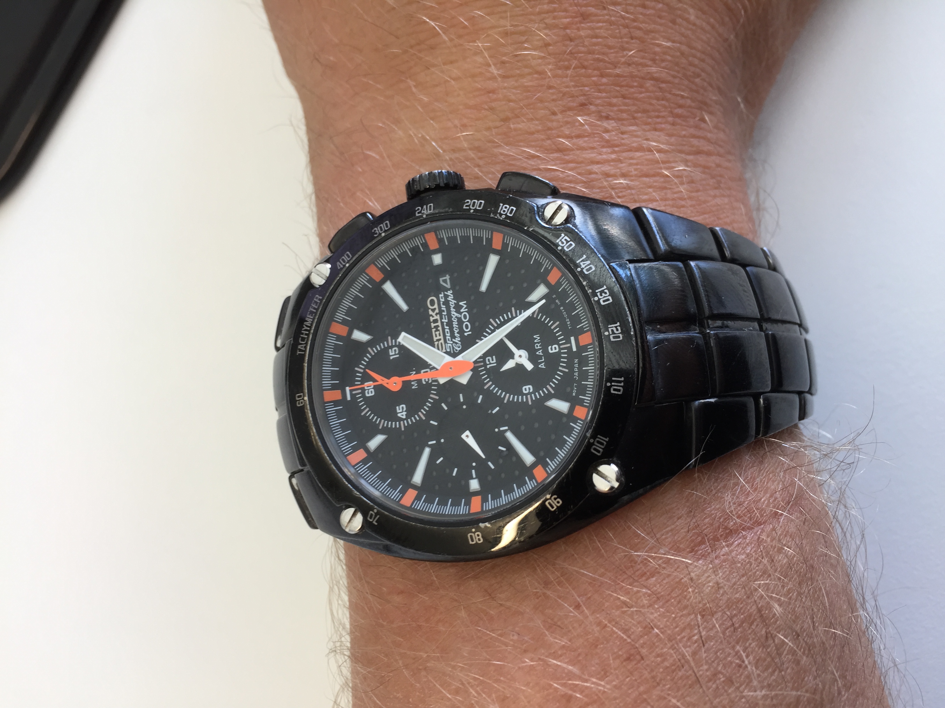 Jeg bidrar med min budsjettklokke, en Seiko Sportura Chronograph. Fikk den på billigsalg fra Japan ca 2006-2007, har hatt den på service/batteribytte én gang siden den var ny. Brukes ikke når jeg sykler, men stort sett alltid ellers. Har fått bra med juling, bad i saltvann og i det hele tatt helsårsbruk. Knapt nok synlig. Den svarte overflatebehandlingen på stållenkene er litt blasssere nå enn hva den var som ny, men det er stort sett det hele...