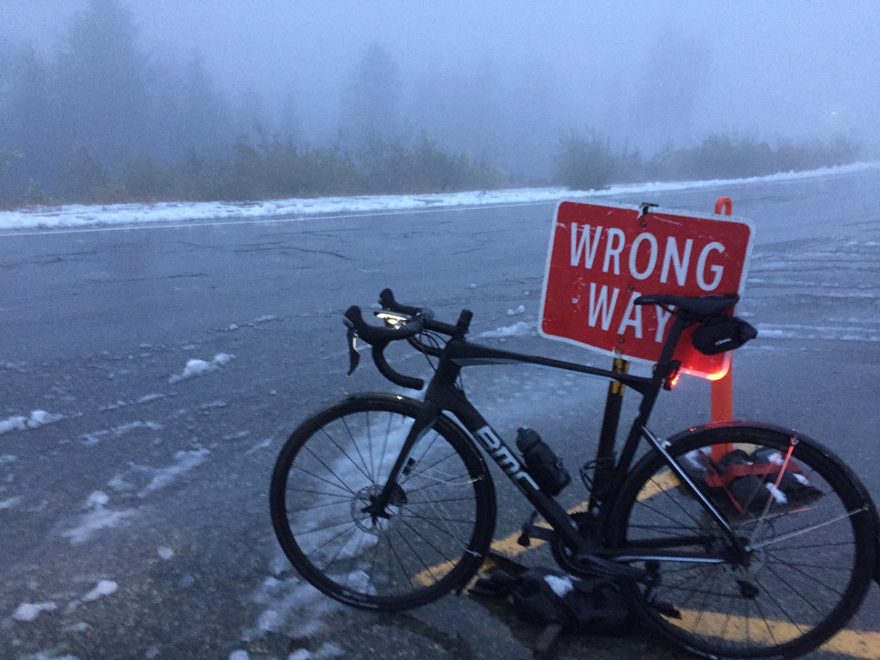 Her er årets vintersykkel for min del. Bor et år i Vancouver og her er vinteren først og fremst våt. Sykkellen er en BMC Roadmachine O2 TWO. Denne er satt opp med skjermer og Schwalbe ProOne Tubeless 28mm og heldekkende skjermer. Sykkelen blir nokså tung i bakkene, men fungerer bra som en stabil og sikker sykkel i regnværet her. Har satt opp et ekstra hjulsett med 45NRTH Xerxes i tilfelle frost. Disse går fint inn i rammen, men da må skjermene av. Xerxes har lange støpehår som børster bort i rammen. For ikke å risikere å lage riper i rammen fikk disse en omgang med neglesaksen.