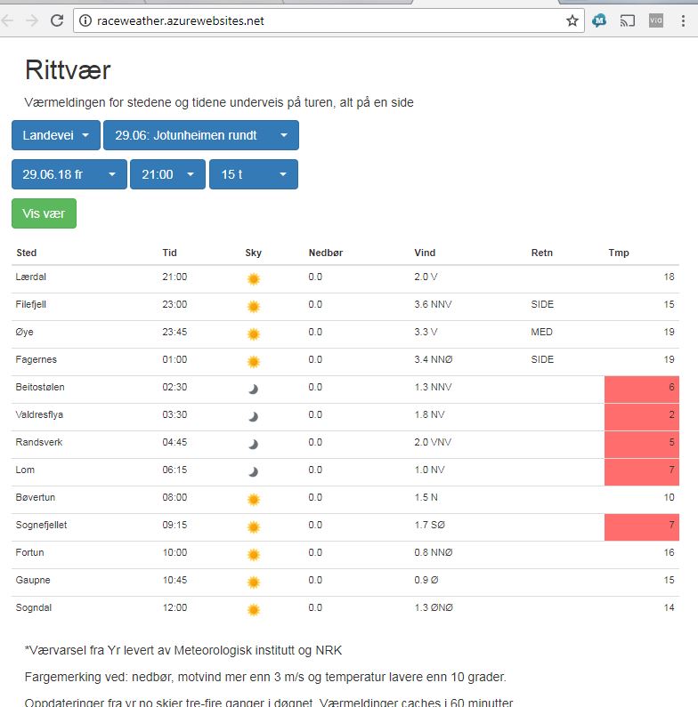 Løfter denne da det nærmer seg. Været ser bra ut, men med store temperaturforskjeller over fjellet i følge YR data på http://raceweather.azurewebsites.net/ Hva tenker de erfarene her fra JR og tilsvarende aktivitet om påkledning fra start og hva man har på lommene og eventuelt planlegger å ta på underveis. Den Valdresfly temperaturen kan jo være skremmende. Vurderer klubbtrøye med vest til Fagernes med løse ermer og kanskje løse knær. Alternativ Gabba trøye som varmer litt mer og med en tynn jakke trolig fungerer over flya. Må vel vurdere løse bein fra Fagernes uansett.