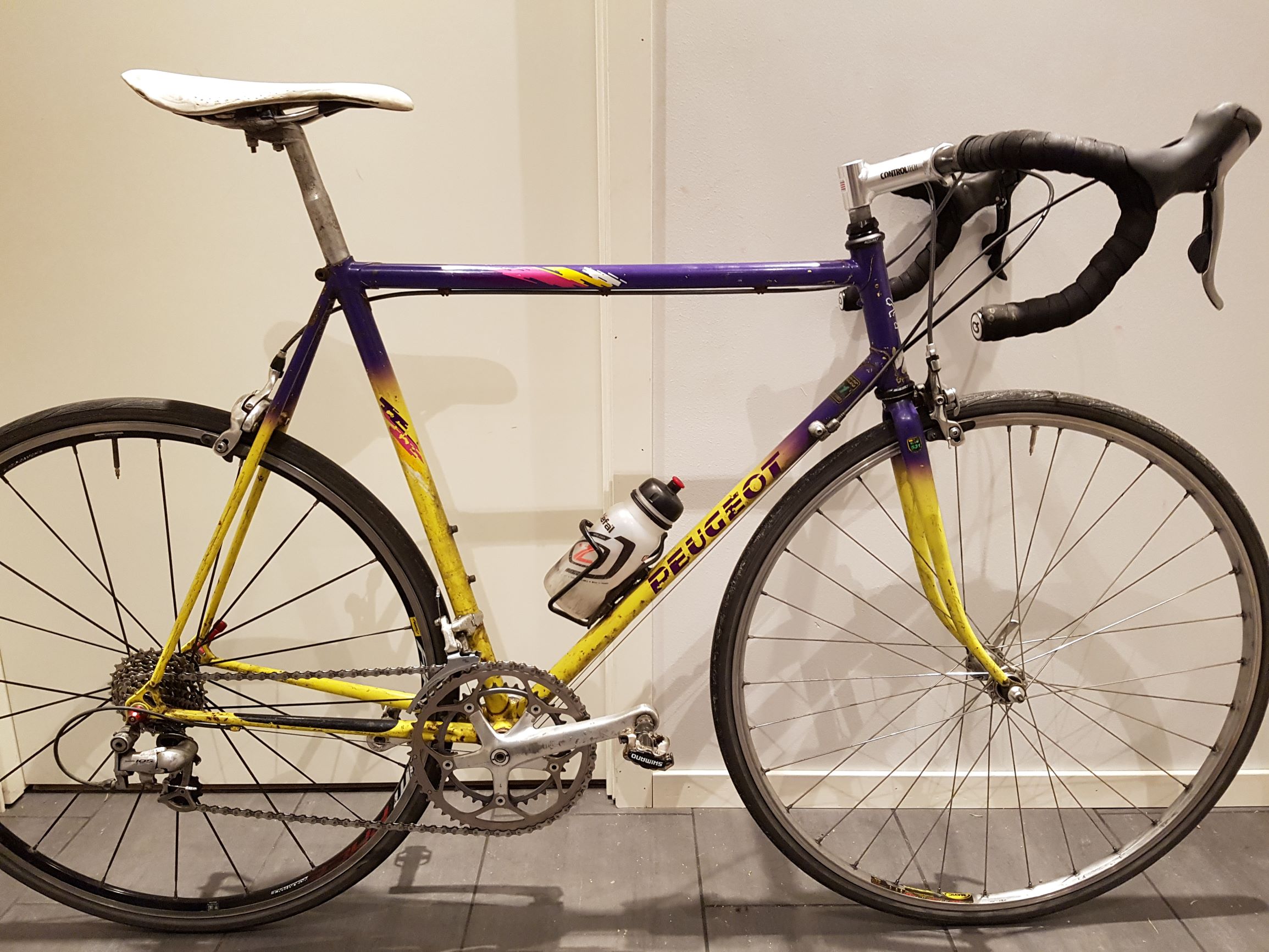 I år kan bli siste år for denne trofaste sliter'n Peugeot Galibier, 1990-modell, Reynolds 531. I familiens eie siden ny, og i daglig bruk som man sier i bilannonser. Brukes som commuter nå, og fikk komme inn i gangen etter kveldens kvartalsvise ritual med en kjapp sjekk + nytt kjede. Bakramma er 126mm, styrelagerkopper sitter sånn passe fast i ramma, etc... Men fornøyd likevel, kvikk og lydløs, perfekt størrelse. Ber om forlatelse for fargekombo sete - styretape, terrengpedaler og klessnorer til girwire, men jeg ser alltid i egne og andres rotekasser først, når noe må skiftes.