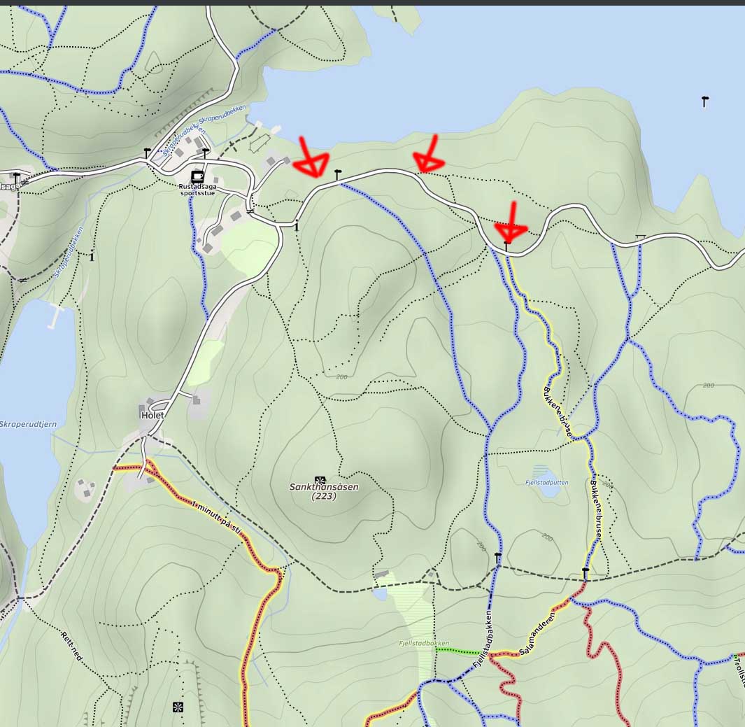 Hei, er det noen som har vært ute i det siste og kan fortelle meg; - om den grusveien jeg har markert med røde piler er brøytet inn til der Bukkene bruse svinger av? - på sti - er det piggdekk som gjelder, eller funker det uten?