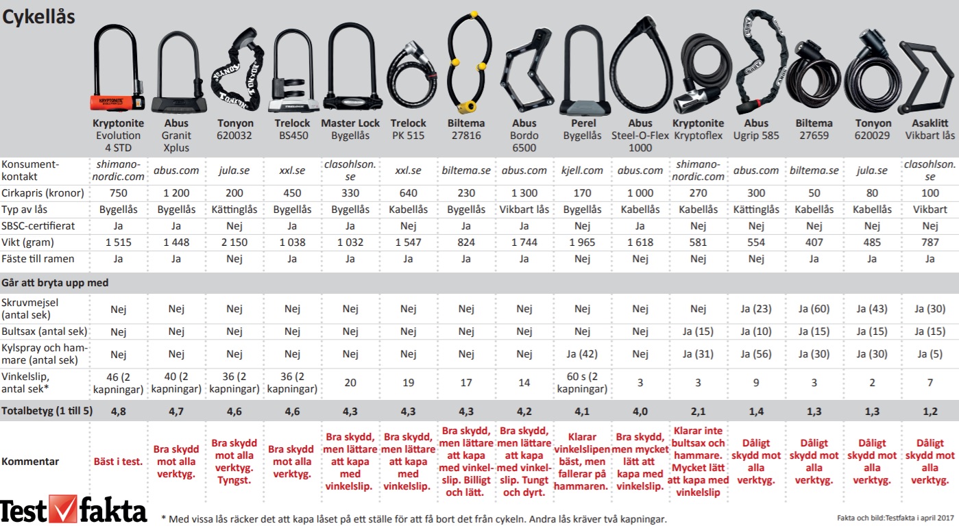 Interessante resultater, men i likhet med testen fra NAF/Testfakta (se over) er jeg skeptisk til enkelte av dem. F.eks. scorer to lettere låser fra Abus - bøylelås Ultra Mini 410 (8/15) og kjedelås Ionus 6800 (5/15) - høyere enn mitt valg for lås nr. 2 Granit Plus 640 (12/15), selv om de får betydelig lavere rating fra Abus og er laget av tynnere materiale og har enklere låser. Skulle gjerne visst mer om hvordan de enkelte testene ble gjort.