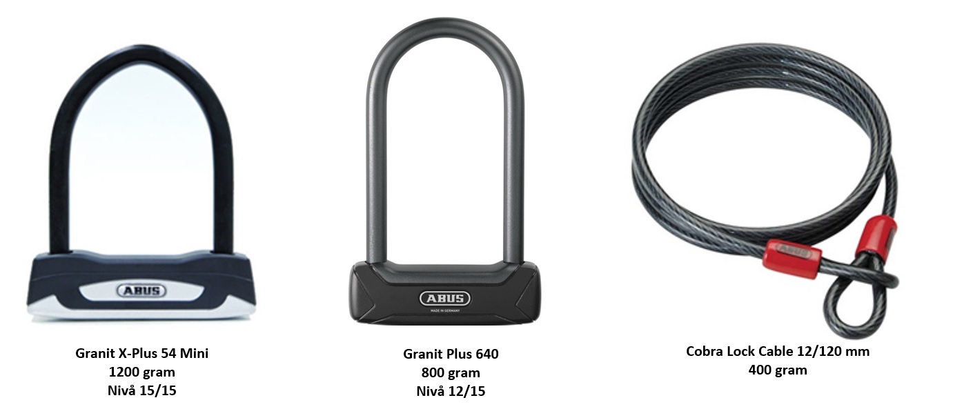 Med disse låsene kan jeg kjøre flere forskjellige oppsett, alt etter hvor jeg skal parkere og hvor mye vekt jeg vil drasse på: - To bøylelåser med en kabel. Ca. 2400 gram. - To bøylelåser. Ca. 2000 gram. - Sterkeste bøylelås med kabel for å sikre forhjul. Ca. 1600 gram. - Letteste bøylelås med kabel for å sikre forhjul. Ca. 1200 gram. - Kun sterkeste bøylelås. Ca. 1200 gram. - Kun letteste bøylelås. Ca. 800 gram.