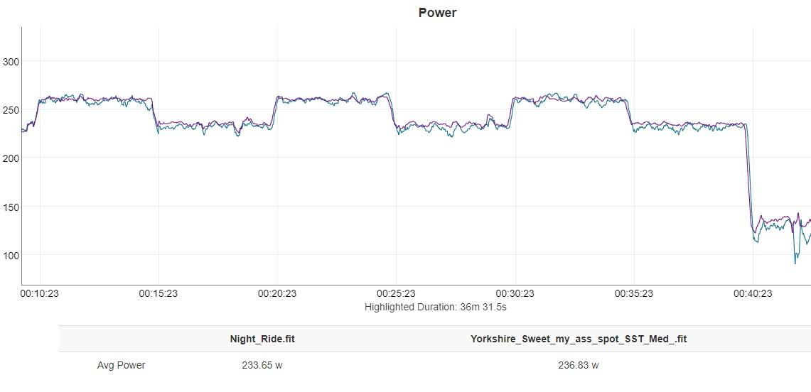 Alt i alt kan jeg være veldig fornøyd og si at det er perfekt samsvar og at effekten på rulle og utendørs er lik. Men det er bare det at dette er en spesielt god økt. Vanligvis ligger samsvaret på rundt 3-5% ikke under 1,5%. HVorfor jeg av og til får perfekte grafer som dette og av og til bare bra nok aner jeg ikke. Konklusjonen er uansett at alt er bra nok. Klarer jeg ikke holde den effekten jeg har planlagt kjører jeg enten til jeg sprekker eller reduserer.