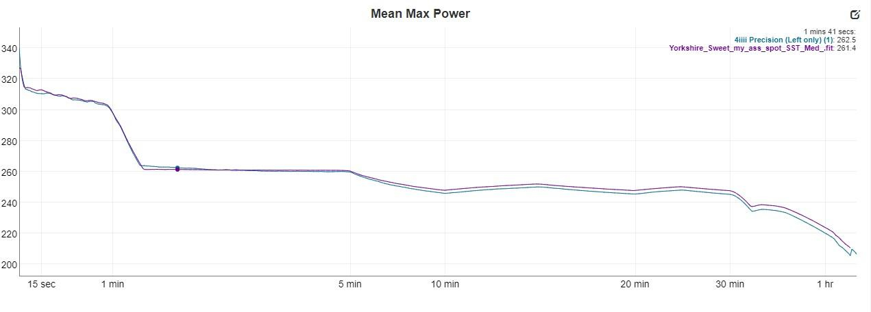 Siden jeg bare kan bruke to om gangen av naturlige årsaker kan jeg ikke parallellmåle flere mot hverandre. Under ser vi litt av en intervalløkt der jeg ligger på ca 260 watt, og en MeanMax graf for hele økta. Den grønne linja er 4iii og den lilla er Direto XR. Grafen er glattet med 15 sekunders gjennomsnitt. Vi ser at krankmåleren reagerer mye raskere enn rulla. Særlig der jeg slipper opp. Snittwatten i uttrekket er innenfor 1,5% Det samme fine bildet er gjeldende for hele økta i MeanMaxgrafen.