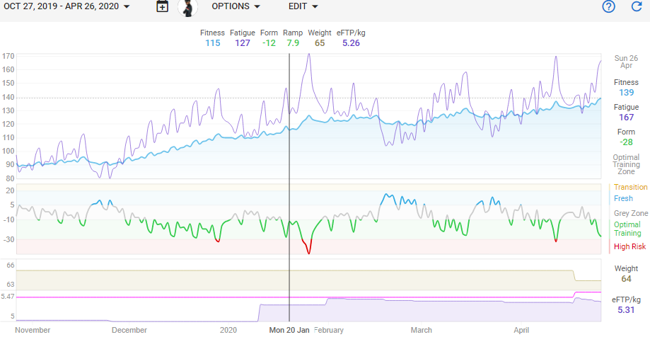 For egen del har dette opplegget ført til god framgang de siste par årene. Mest fordi jeg har lært meg å kjøre rolig når jeg skal, men og pga kontinuitetpå treningen gjennom året. Som en følge av en god vinter hadde jeg i mars wattnivåer på høyde med sommersesongen 2019, dermed synd det er lite av ritt på denne siden av sommeren.