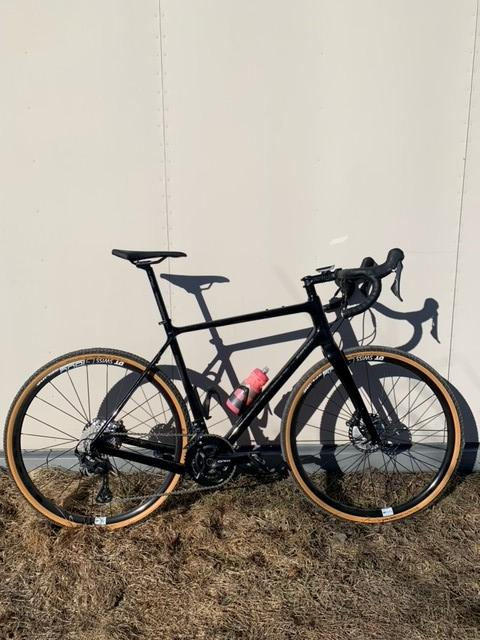 Slaten har fått seg en ansiktsløftning i år. Ut med Ultegra 2x10 og på med X01 Eagle AXS (10-50). Fant ikke post mount caliper fra Force, så da ble det Red hendler og bremsecalipere. En såkalt "mullet" build med andre ord. Foran ble Spidering byttet ut med et Wolf Tooth Direct Mount drev. En enkel frame bag måtte også på for å virkelig henge med i trendbildet. Er tidligere oppgradert med LB AR36 på 240S, samt KS Lev Integra 272 dropper. Vennligst overse den gjøglete bar-tapen som var det jeg hadde på lager. Smått utrolig at denne ble levert med 52/36 og 11/28. Fantastisk grussykkel.