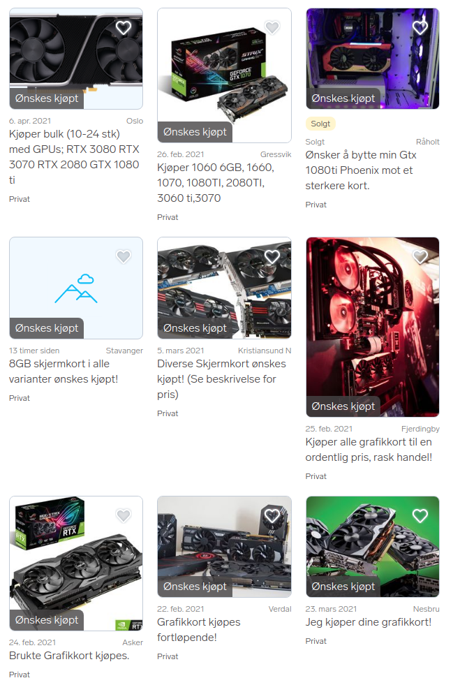 Rask tur på finn, søkte etter "GTX-3070", og valgte "ønsket kjøpt" kategorien. Ser ut som majoriteten her er villig til å kjøpe i bulk/flertall. Da antar jeg det er mining, ikke gaming som er det tiltenkte målet.